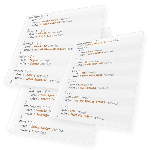 By combining advanced VINs analysis with multiple verified database sources, API.VIN delivers key technical specifications and general vehicle equipment information in a clean, structured format. You get production year, make, model, body type, fuel type, engine power, and available equipment details – all ready to integrate directly into your business systems.